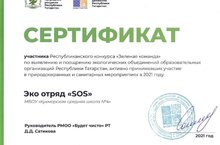 Экоотряд «SOS» принял участие в Республиканском конкурсе «Зеленая команда» и награжден сертификатом участника по выявлению и поощрению экологических объединений образовательных организаций РТ, активно принимавших участие в природоохранных и санитарных мероприятиях в 2021 году.
