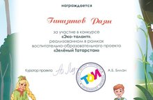 Гиниятов Раян, учащийся 1 а класса МБОУ КСШ 4 принял участие в конкурсе "Эко-талант", реализованный в рамках воспитательно-образовательного проекта "Зелёный Татарстан" и награждён дипломом#эковесна2020#воспитаниекукмор#кукморскийрайон