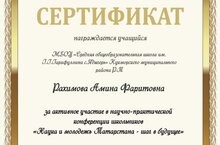 В Казанском государственным аграрном университете 22 марта 2024 года прошла ежегодная научно-практическая конференция "Наука и молодежь Татарстана - шаг в будущее". Ученица 7 класса МБОУ "СОШ с.Ядыгерь" Рахимова Амина (руководитель - Рахимова Р.Р.) прошла на второй тур и приняла дистанционное участие в номинации "История родного края" и была награждена сертификатом за активное участие в научно-практической конференции. Мы желаем Амине расти и развиваться дальше. Ведь участие в НПК помогает учащимся развить свой интеллект в творческой, самостоятельной деятельности, расширить свой кругозор, углубить знания. Мы желаем тебе успехов, Амина, все только начинается!