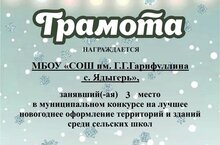 Наша школа заняла 3 место в муниципальном конкурсе на лучшее оформление территорий и зданий среди сельских школ. Поздравляем и благодарим всех учащихся, их родителей и учителей, которые внесли свой вклад в новогоднее оформление школы!