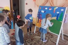 Дети по очереди прикрепляют веревочки, начиная с красной, вспоминая и называя расположение цветов в радуге.