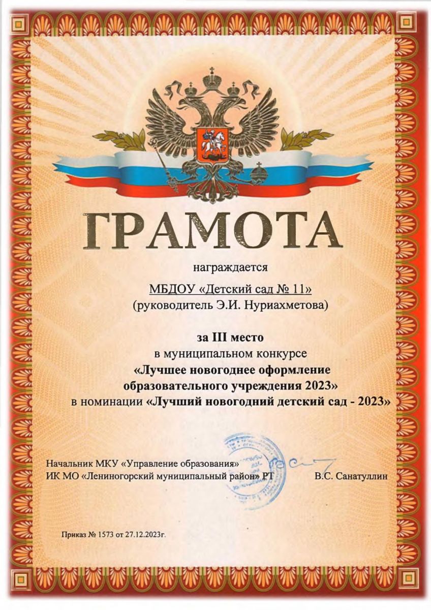 В соответствии с приказом МКУ «Управление образования» ИК МО «Лениногорский муниципальный район» № 1446 от 01.12.2023 г., в целях совершенствования воспитательных мероприятий, привлечения образовательных учреждений к новогоднему оформлению, с 13 по 22 декабря 2023 года в Лениногорском муниципальном районе прошел конкурс «Лучшее новогоднее оформление образовательного учреждения 2023». В данном мероприятии приняли участие 38 образовательных учреждений района и города. По итогам конкурса, НАШ ДЕТСКИЙ САД ЗАНЯЛ III МЕСТО в муниципальном конкурсе. ПОЗДРАВЛЯЕМ!