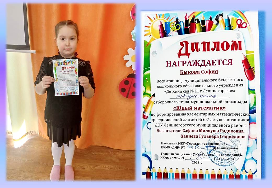 Поздравляем Быков Софию, победительницу отборочного этапа муниципальной олимпиады "Юный математик" по формированию элементарных математических представлений для детей 6-7 лет.
