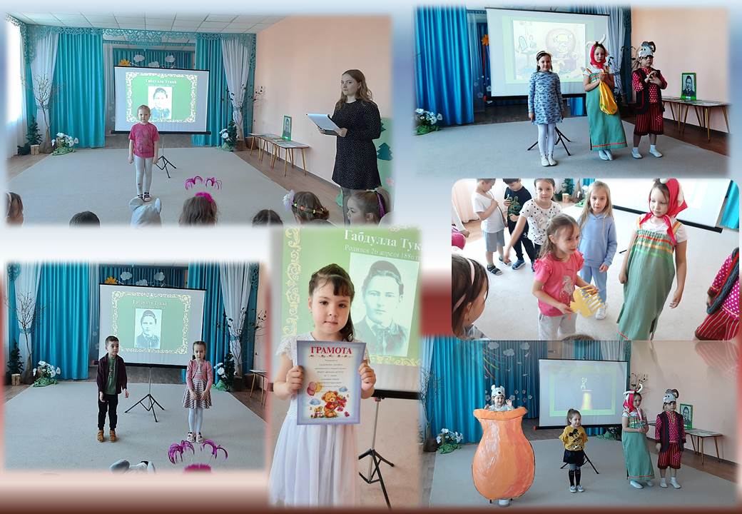 День рождения Габдуллы Тукая. В нашем детском саду прошло мероприятие, посвященное Дню рождения Габдуллы Тукая. Врспитанники вместе с воспитателем по обучению татарскому языку Мухаммадиевой Л.Р. вспоминали сказки и стихи Габдуллы Тукая. На этом празднике дошколята пели песни , показывали подготовленные ими инсценировки из сказок Тукая. В гости на праздник к ребятам пришли герои сказки: Коза и Баран. Дети с большим интересом и радостью участвовали в этом тематическом мероприятии. Так же в ходе этого мероприятия был проведёт конкурс чтецов "Тукай в наших сердцах", все участники были награждены грамотами.