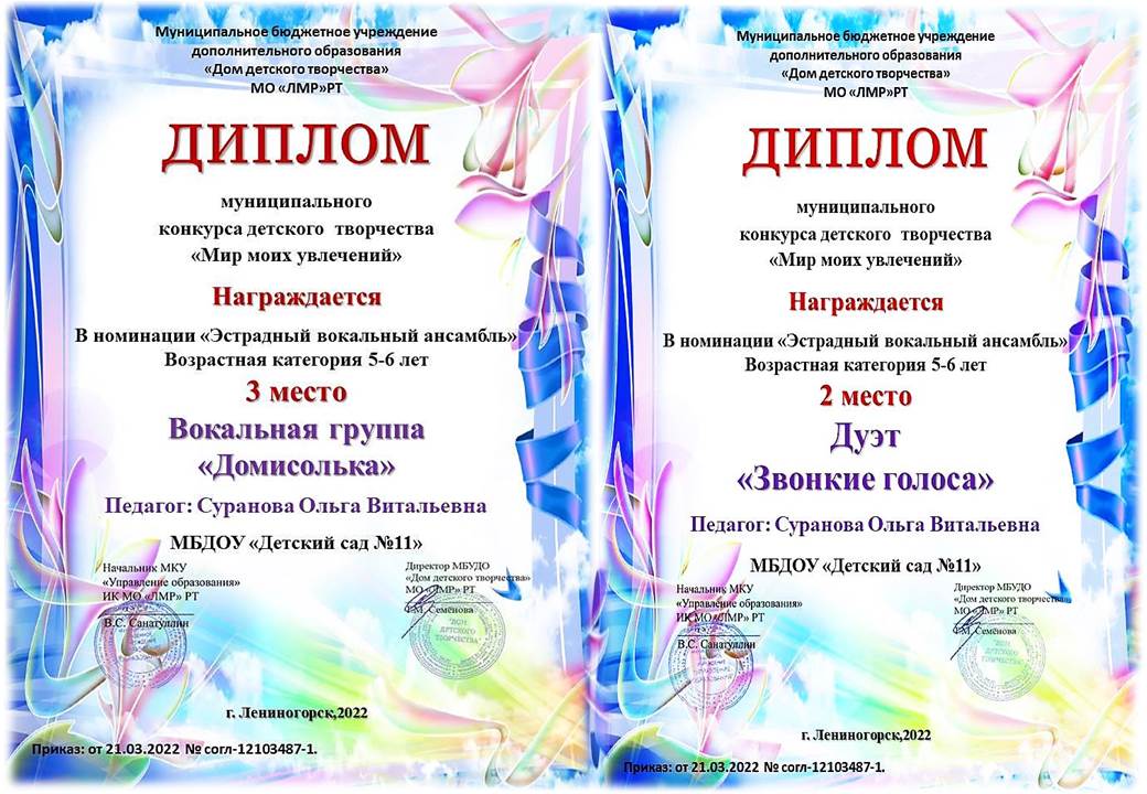 Поздравляем Суранову О. В., музыкального руководителя и вокальную ГРУППУ «ДОМИСОЛЬКА», ДУЭТ «ЗВОНКИЕ ГОЛОСА» с призовыми местами в муниципальном конкурсе детского творчества «Мир моих увлечений» в номинации «Эстрадный вокальный ансамбль».