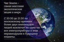 25 марта 2017 года с 20:30 до 21:30 по местному времени, будет проходить международная акция "Час Земли", инициированная Всемирным фондом дикой природы. В этот день по всему миру участники акции должны выключить свет, тем самым выразив свое внимание к проблемам Планеты, сохранения природы и сбережения ресурсов Земли.