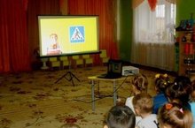 Воспитанники младшей группы знакомятся с дорожными знаками через обучающий фильм .