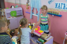Сегодня, в ходе самостоятельной деятельности, дети ознакомились более подробно с профессией продавец. Дети принимали участие в игре и с удовольствием исполняли роли как продавца, так покупателя.