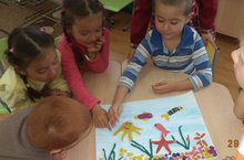 В детском саду идёт тематическая неделя посвящённая воде, поэтому ребята почти всё своё время проводят в изучении и познании "волшебницы воды". 28 июля в понедельник дети совместно с воспитателем сделали аппликацию морского дна : там и морская звезда и рыба клоун и медуза.