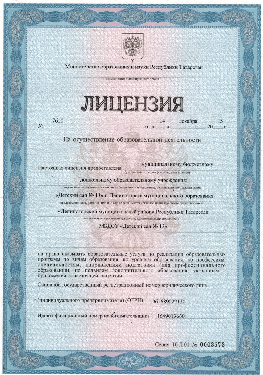 муниципальное бюджетное дошкольное образовательное учреждение "Детский сад №13" г.Лениногорска муниципального образования "Лениногорский муниципальный район" Республики Татарстан / Татарстан Республикасы «Лениногорск муниципаль районы» муниципаль берәмлеге Лениногорск шәhәренең «13-нче санлы балалар бакчасы» муниципаль бюджет мәктәпкәчә белем бирү учреждениесе