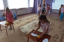- игра «Плавуны», где дети надевали на себя надувные круги и пробегали по ленте, изображая, что плывут по реке.