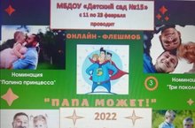 Флешмоб «Папа может» в онлайн формате среди родителей и воспитанников МБДОУ «Детский сад №15» проводился с 11 по 23 февраля 2022г. в рамках мероприятий, посвященных празднованию Дня защитника Отечества, с целью совершенствовать работу детского сада с родителями воспитанников посредством дистанционных форм взаимодействия.