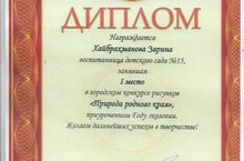 Воспитанница подготовительной группы Хайбрахманова Зарина заняла 1 место ы городском конкурсе рисунков "Природа родного края". Организатором конкурса являлась Детская библиотека им. Ю. Гагарина. Поздравляем победительницу, желаем ей дальнейших успехов!!!! Подготовила воспитатель Люгаева Е.С.