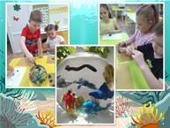 Особенный мир, который находится в просторах воды. Он манит и восхищает. Это загадочное царство с его необычными обитателями: необычные растения, грозные акулы, задорные дельфины и веселые разноцветные рыбки. Как много приключений можно найти в морском царстве. Перед ребятами стояла не простая задача, а именно вылепить нового морского обитателя и придумать, какое приключение могло с ним произойти.