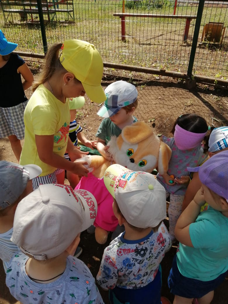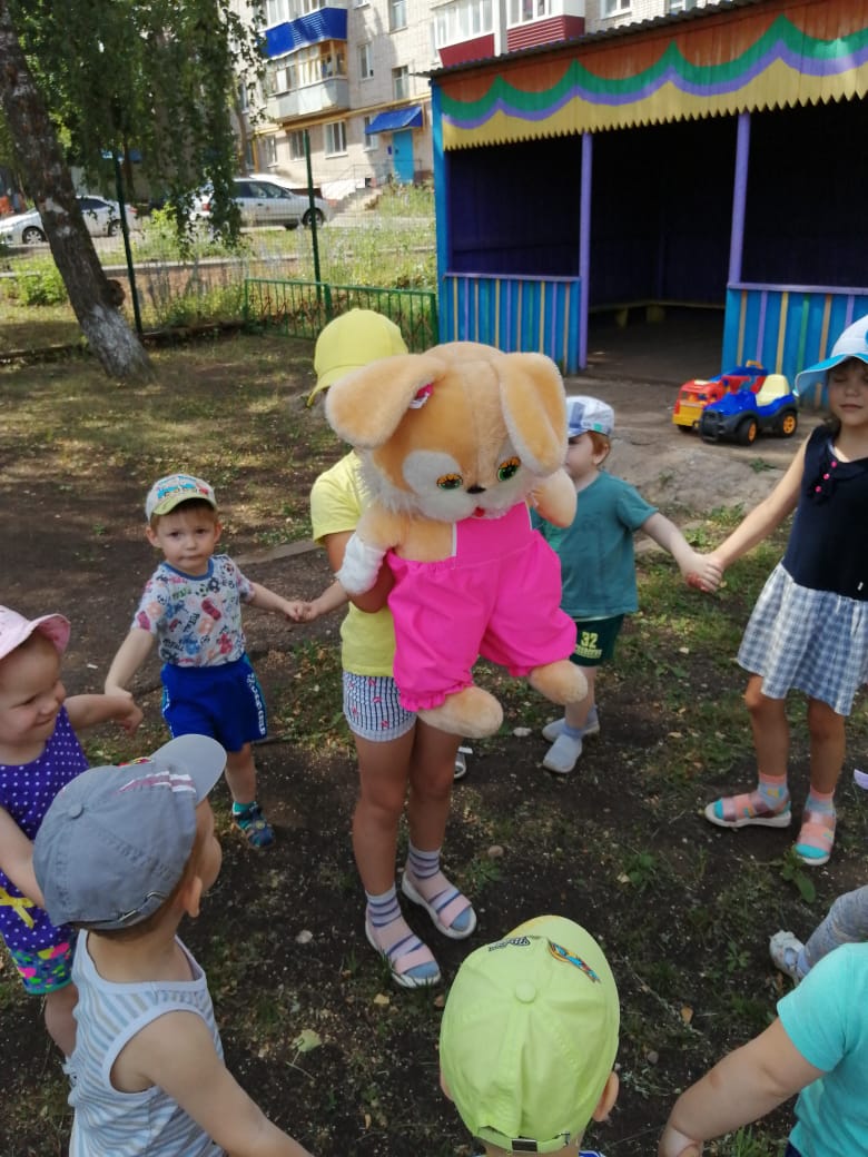 Сегодня с воспитанниками первой младшей группы было проведено развлечение «Летом отдыхаем, но Правила дорожного движения не забываем!» В гости к нашим малышам пришёл зайчик, который чуть- чуть не попал под машину. Оказывается, пока он отдыхал, он совершенно забыл, как правильно переходить дорогу. Он попросил у малышей научить его этому мастерству. А наши дети не только рассказали гостю, что такое светофор, пешеходный переход и почему его называют «зеброй», но и провели мастер- класс, как правильно и без последствий вести себя на проезжей части.