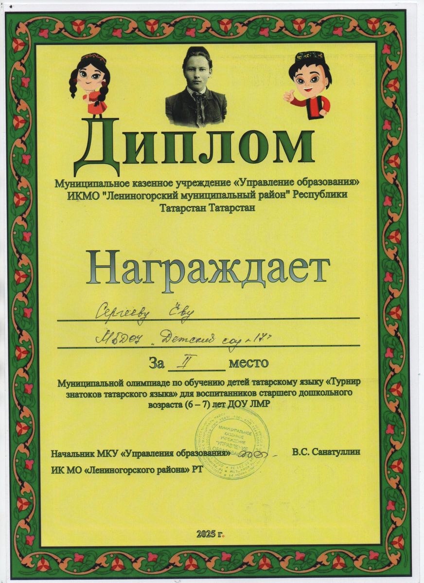 Поздравляем нашу воспитанницу подготовительной к школе группы Сергееву Еву и её руководителя Гульназ нуровну Абдуллину с ПОБЕДОЙ в муниципальном конкурсе по татарскому языку "Турнир знатоков татарского языка"- мы вами гордимся!