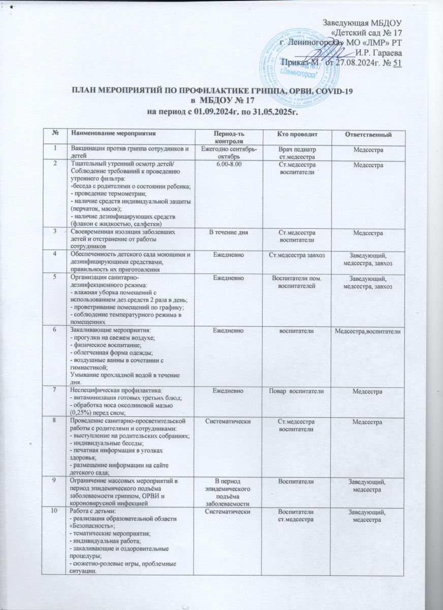 План мероприятий по профилактике гриппа, ОРВИ , COVID-19 на период с 01.09.2024г. по 31.05.2025г.