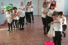 Коршина Ю.Ю., руководитель дополнительного образования «Радуга ритмов», создала веселое, радостное настроение ребятам, посещающим данный кружок. В ходе развлечения дошкольники встретились с Зимой, упражнялись с ней в спортивных играх и упражнениях, танцевали и на прощание исполнили ей песню «Зимушка Хрустальная». // Коршина Ю. Ю., «Радуга ритмнары» өстәмә белем бирү җитәкчесе, түгәрәккә йөрүче балаларга күңелле, шатлыклы кәеф тудырды. Күңел ачу барышында мәктәпкәчә яшьтәге балалар кышын очраштылар, аның белән спорт уеннарында һәм күнегүләрдә шөгыльләнделәр, биеделәр һәм саубуллашканда аңа «Кристальная Зимушка»җырын башкардылар.