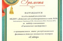 Поздравляем театральный коллектив с победой в номинации «Сценическое мастерство» в муниципальном этапе республиканского фестиваля детских и юношеских театров «Сайяр». Желаем не останавливаться на достигнутом результате и стремиться развиваться и познавать все большее. Пусть всегда горит энтузиазм в глазах и раскрываются возможности. Вперед, к новым победам!