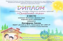 Поздравляем воспитанницу подготовительной к школе группы Канзафарову Эмилию со вторым местом в региональном конкурсе семейных проектов "Семейный очаг". Подготовила воспитатетль: Салимова Г.Р.
