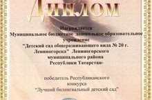 Наш детский сад награжден дипломом Министерства образования РТ "Лучший билингвальный детский сад" и получен сертификат на получение гранта 1 000 000 рублей.