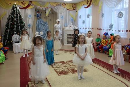 Дети пришли на представление нарядные мальчики в костюмах Зайчиков, а девочки в костюмах Снежинок, весёлые в предвкушении праздника. С появлением Деда Мороза начался настоящий праздник с песнями и танцами, дети читали стихи.