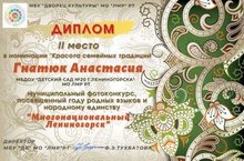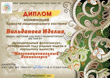 В Доме Культуры г. Лениногорска состоялся муниципальный конкурс «Многонациональный Лениногорск», целью которого является: сохранение и развитие этнокультурного многообразия народов Татарстана, посвященный году родных языков и народного единства в Республике Татарстан. В данном конкурсе приняли активное участие дети нашего детского сада. Ребята награждены дипломами: Вильданова Иделия в номинации «Красота национального костюма» (рук. Афандиева Л.М.); Петрова Елизавета в номинации «Мозаика родных узоров» (рук. Минахметова З.Р.); Галиев Амир в номинации “Многоцветие родных орнаментов” (рук. Зиганшина Р.Я.); Гнатюк Анастасия II место (рук.Горбачева Н.А.).