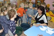 С детьми 1 младшей группы (воспитатель: Потапова И. Г.) была проведена экспериментальная деятельность под названием: «Кораблик умеет плавать по воде», с целью расширения представлений о свойствах дерева; малыши учились устанавливать причинно-следственные связи между свойствами материала и способами его использования. В процессе экспериментирования малыши кидали камушки в воду, опускали кораблики и делали вывод: "Что тонет в воде, а что нет". Ребята получили новые сведения о свойствах дерева в игровой форме.