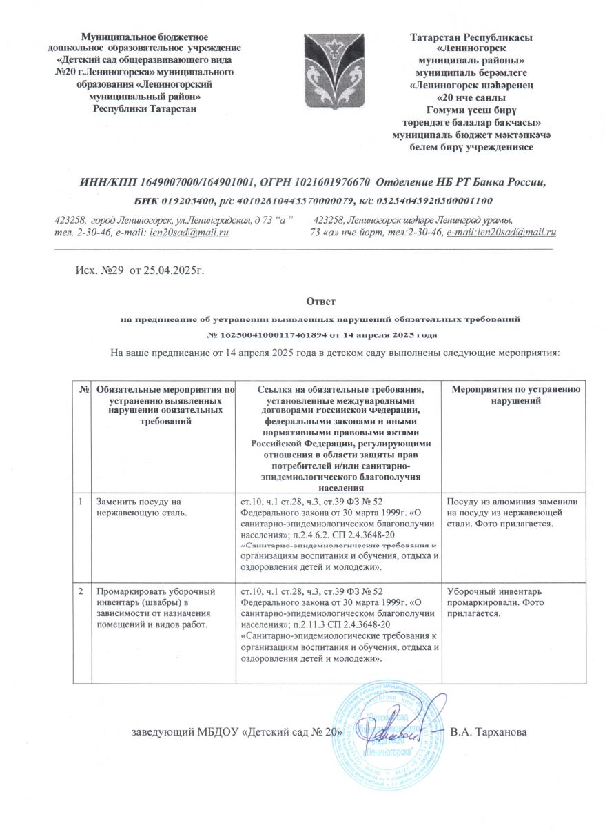 Предписание от 14.04.2025г. № 16250041000117461894 Управления Роспотребнадзора по РТ