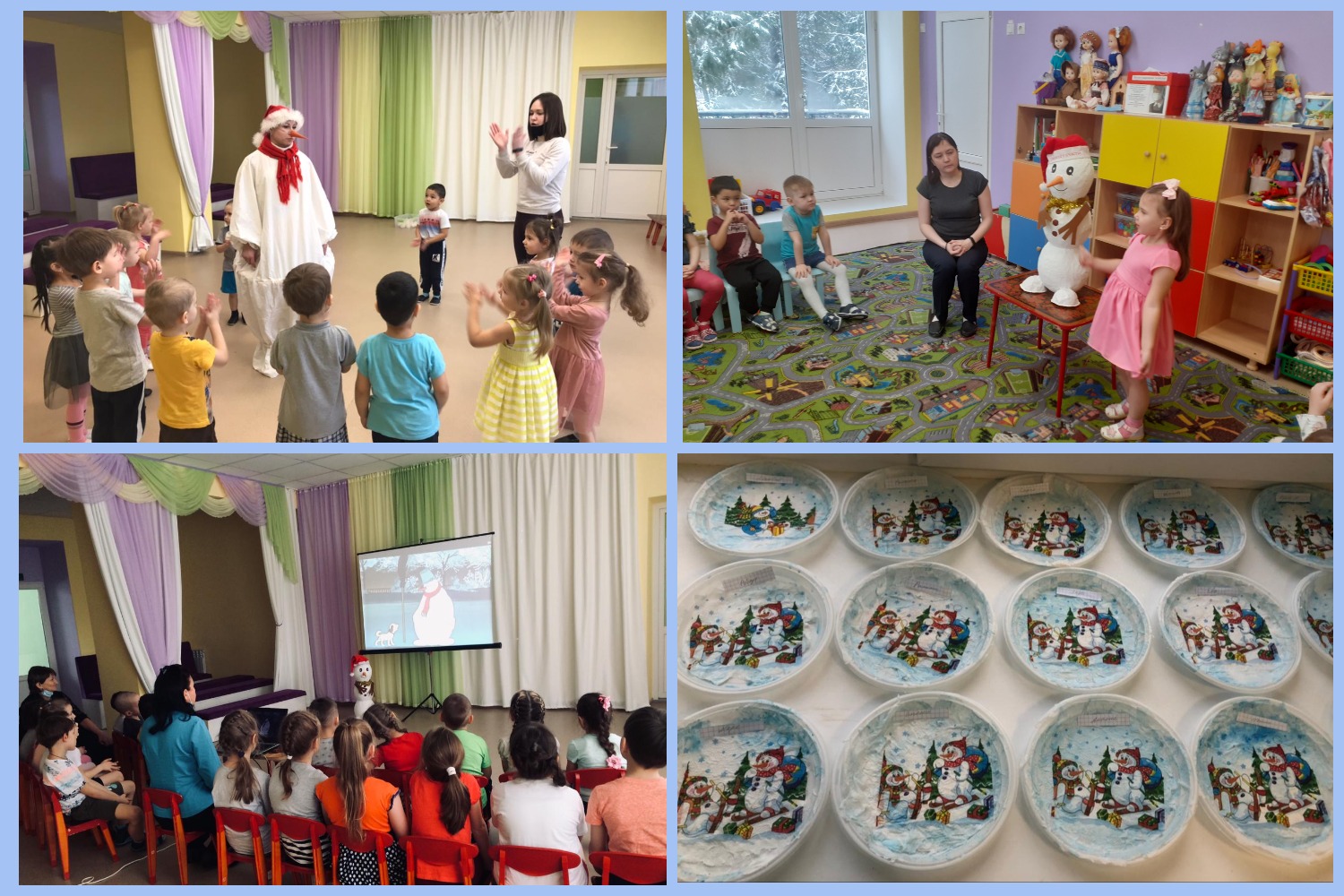 Снеговик является самым популярным зимним сказочным героем после Деда Мороза и Снегурочки, какая же зима без любимца детворы? Вот и он удостоен чести праздновать свой День – 18 января. День снеговика – один из молодых, но уже любимых праздников детворы. Так и наши ребята вместе с воспитателями посвятили эти дни этому забавному герою. Наш друг Снеговик зашел в гости к детям второй младшей группы. Детвора была в восторге от неожиданной встречи, и малыши с удовольствием поиграла с ним в снежки, спели ему песню. А ребята другой второй младшей группы старательно делали аппликацию: «Мой друг-Снеговик». Дети средней группы вместе с воспитателем устроили игру- почемучку, где ребята находили ответы на интересные вопросы о зиме, зимних явлениях, отгадывали загадки, беседовали на темы: «Откуда пришел снеговик?», «Снеговик – лучший друг Деда Мороза», «Почему Снеговик любит холод?». Воспитанники старшей группы смастерили красивые пано-тарелочки с изображением снеговиков в нетрадиционной технике декупаж. А ребята подготовительной к школе группы посмотрели мультфильм на татарском языке «Хат ташучы Кар малай» («Снеговик – почтовик») про Снеговика, который доставил письмо от детей Деду Морозу. Ну, а зима еще в самом разгаре, и ребята еще не раз будут лепить из снега этих забавных снежных героев, которые будут красоваться на участках.