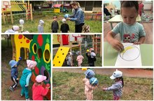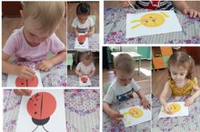 Ах, лето, прекрасная пора! Пора наблюдений любопытных ребятишек за природой. Их привлекает всё и все: зеленые луга и леса, яркость цветов, ягоды, бабочки, жуки…Самые маленькие наши воспитанники вместе с воспитателями с большим интересом наблюдают на прогулочном участке за солнышком и облаками, насекомыми, любуются цветами. Гульнара Зядитовна, воспитатель первой младшей группы, предложила деткам запечатлеть свои наблюдения на листах бумаги. Юные художники нарисовали лучики к солнышку, а с помощью ватных палочек изобразили божьих коровок.