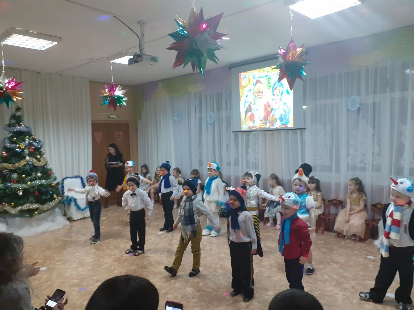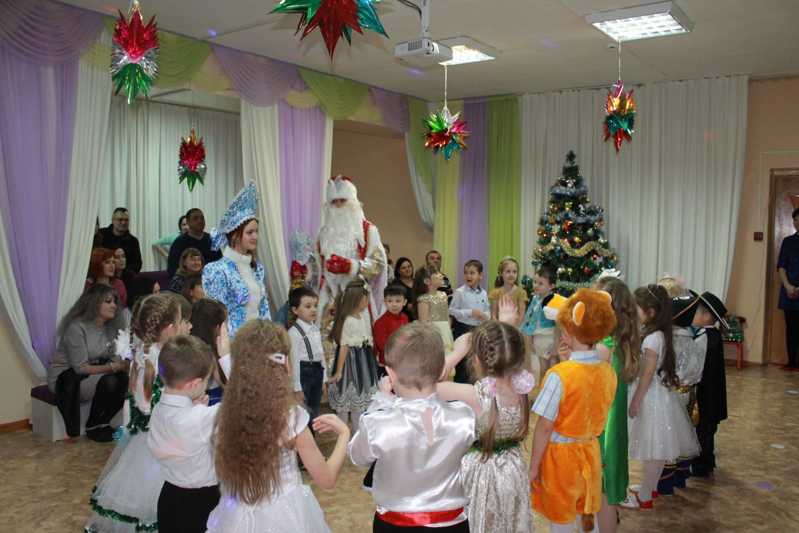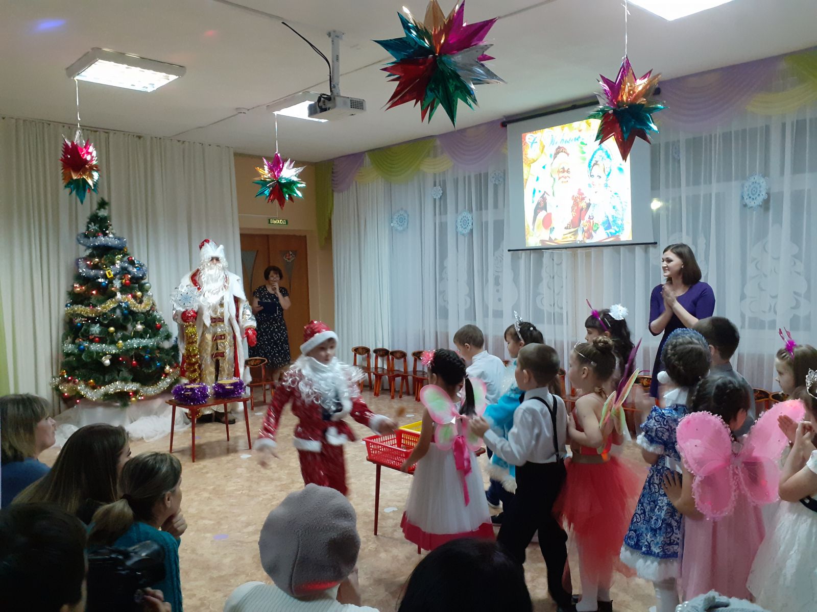 Для детей младших групп прошли новогодние представления. Так, в гости к самым маленьким воспитанникам пришли Снегурочка, Дед Мороз и Лисонька. Малыши спели песенки, почитали стишки, поплясали, поиграли в игры «Зайчики и Лисичка», «Собери снежки». А ребятки второй младшей группы оказались в сказке «Заюшкина избушка», где они встретились с Зайчиком и хитрой Лисичкой. И вместе с Дедом Морозом и Снегурочкой ребята помогли Зайчику отвоевать свою избушку, а Лисичку простили. И все вместе заводили хоровод у ёлочки, танцевали, играли в игры, порадовали Деда Мороза стихами. Праздники удались на славу! Малыши повеселились от души!