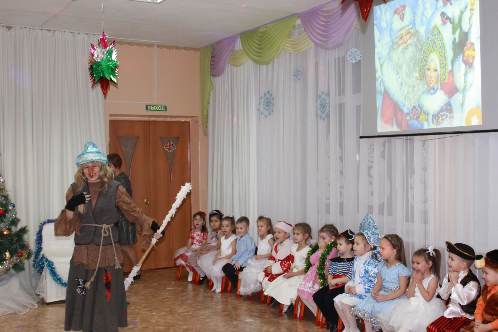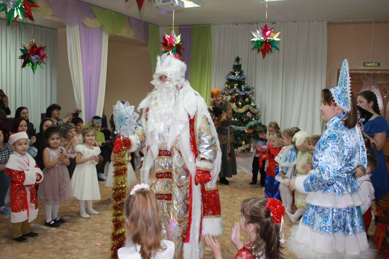 Ждем тебя мы, Новый год!Для детей средней, старшей, подготовительной к школе групп прошли новогодние сказочные представления, где состоялась долгожданная встреча с дорогими гостями: Дедом Морозом и Снегурочкой. Ребята в красочных нарядах в праздничном зале возле нарядной елочки с удовольствием водили хороводы вместе с Дедом Морозом и Снегурочкой, пели песни, исполняли красивые танцы, читали стихи, играли в игры. Ну, как же праздник без сказочных приключений! Неожиданные сказочные герои, коварная Баба – Яга и Черт, что только не делали, чтобы испортить праздник и оставить детей без подарков. Но не тут было! Как и в любой сказке, происходит волшебство, и все хорошо заканчивается. Баба-Яга и Черт подобрели и исправились. А дети получили новогодние подарки от Деда Мороза. Ребята и зрители - родители получили много ярких впечатлений и позитивных эмоций!