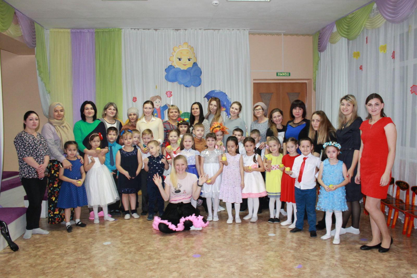 Для детей подготовительной к школе группы осенний праздник был насыщен песнями, танцами, играми-эстафетами, и даже озорная «Простуда» не смогла помешать празднику.