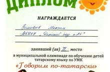 Сегодня наш воспитанник подготовительной к школе группы Зиновьев Максим под руководством воспитателя по обучению татарскому языку Гаязовой В.Р. участвовали в муниципальной олимпиаде по обучению детей татарскому языку по УМК "Говорим по - татарски" и заняли 3 место! Поздравляем!
