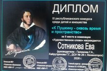 Воспитанница подготовительной к школе группы Сотникова Ева стала победителем - 2 место в III республиканском смотре конкурсе чтецов в номинации "Художественное слово". Ева прочитала вступительные стихи А.С. Пушкина к поэме "Руслан и Людмила" - у лукоморья дуб зеленый.... Желаем дальнейших успехов!