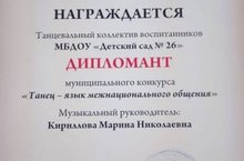 31 января прошел муниципальный конкурс "Танец -- язык межнационального общения" Наши воспитанники с танцем "Якутяночка" под руководством музыкального руководителя Кирилловой М.Н. стали дипломантами. Поздравляем всех с хорошим результатом. Так держать!