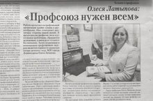 Под таким названием вышла статья в газете "Новое слово"о нашей старшей медицинской сестре Латыповой Олеси Олеговны. Олеся Олеговна является отзывчивым понимающии профсоюзным лидереом. К ней как председателю профкома люди идут со своими проблемами, обращаются за помощью, и никогда не остаются без внимания.