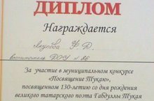 Конкурс "Посвящение Тукаю" был проведен централизованными библиотечными системами г.Лениногорска. Воспитатели вместе с детьми приняли участие в конкурсе рисунков "Сказка в душе моей", а так же в конкрусе "Лучший массовый сценарий". По итогам проведения конкурса воспитатели и дети награждены грамотами.