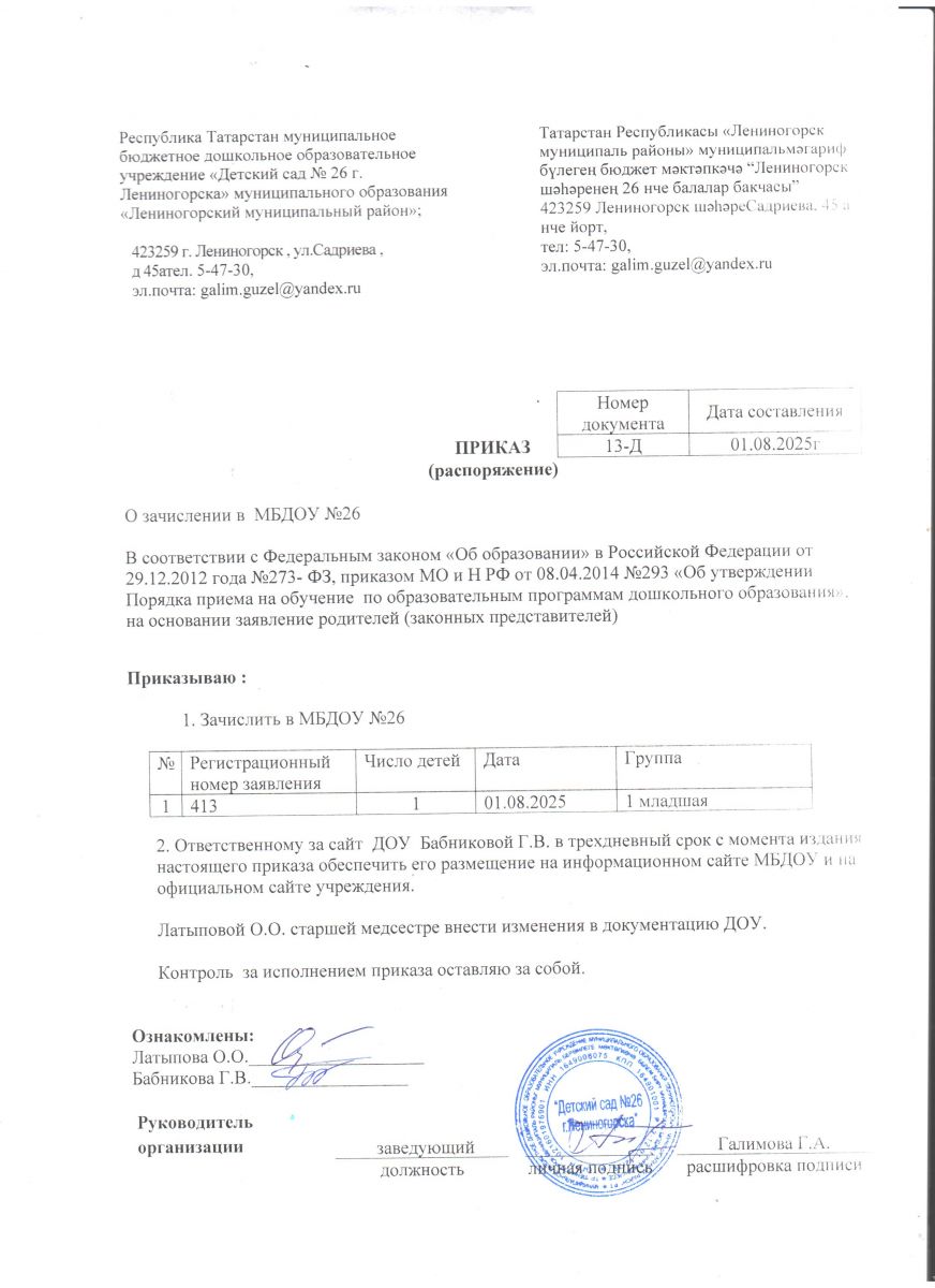 Приказ о зачислении, регистрационный номер 413