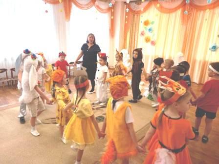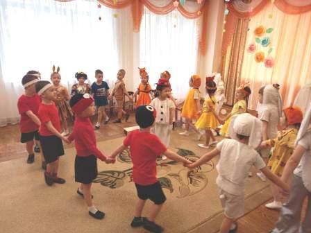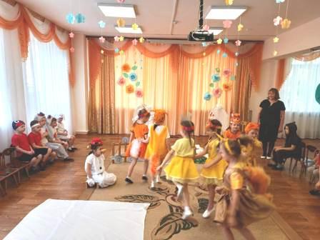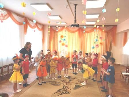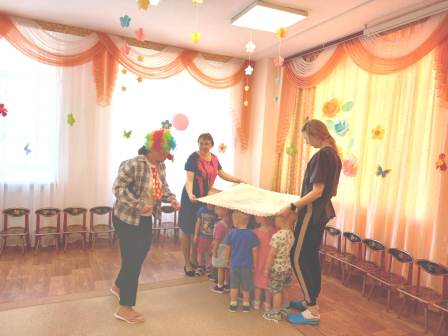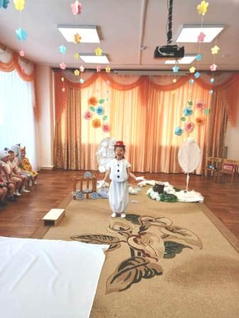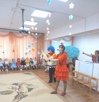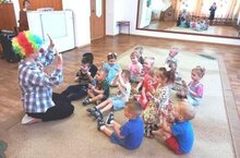 Для малышей первой младшей группы было организованно веселое музыкальное развлечение "В гостях у Тимошки". Главным героем был клоун Тимошка. Дети с Тимошкой играли, разгадывали загадки, пели и танцевали.
