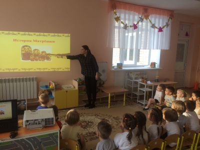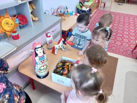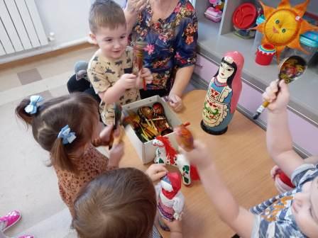 Итогом реализации проекта "Искусство" стала неделя, посвященная знакомству с народным искусством. Дети первой младшей группы совместно с воспитателем рассмотрели народные игрушки (матрешку, дымковских лошадку и индюка, свистульку), поиграли на деревянных ложках. Потом (по желагию детей и родителей) вспомнили народные сказки и пограли в "Репку". Дети были очень довольны.