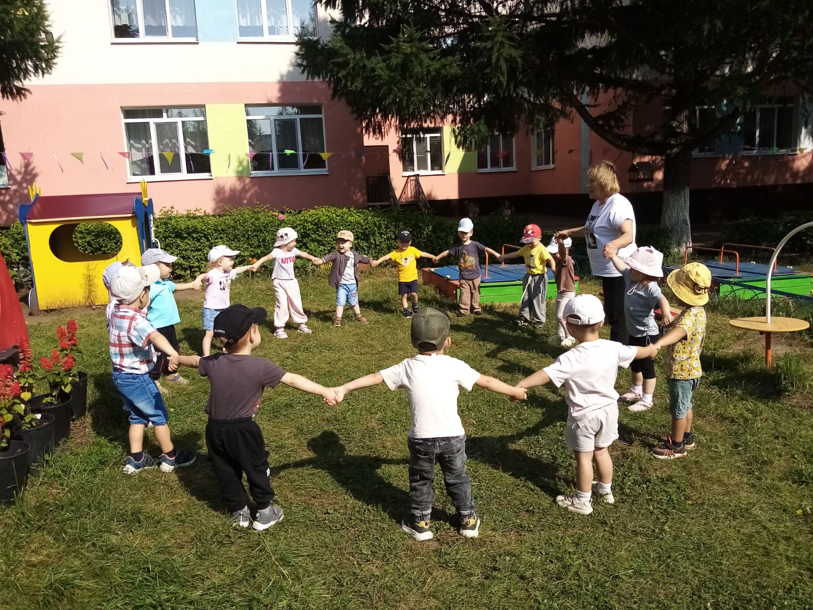Безнең балалар бакчасы территориясендә чәчәкләр, агачлар, куаклар үсә, алар балаларга үсемлекләрнең гаҗәеп матур дөньясын аңларга, яратырга, шулай ук хезмәт күнекмәләрен үзләштерергә ярдәм итә. Ачык һавада, күзәтүләр вакытында балалар белән чәчәкләрне карау кагыйдәләре турында әңгәмә үткәрелде, үсемлекләр белән сак эш итү кагыйдәләре белән таныштылар, чәчәкләрнең исемнәрен ныгыттылар. Тәрбияче балаларга үсемлекләрне карарга тәкъдим итте. Балалар чәчәкләргә рәхәтләнеп су сиптеләр. Балалар бакчасы территориясендәге чәчәк түтәлләре чәчәкләрне карау һәм күзәтү мөмкинлеге генә түгел, ә балаларга, әти-әниләргә һәм хезмәткәрләргә яхшы кәеф тудыра.
