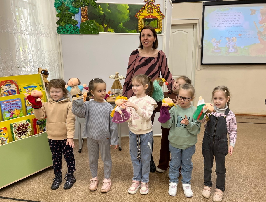 Дети средней группы, в рамках билингвального образования, посетили детскую библиотеку. Сотрудники библиотеки показали детям кукольный спектакль "Ванюша и царевна", провели викторину по русским сказкам, загадывали загадки и играли с куклами в народных костюмах.