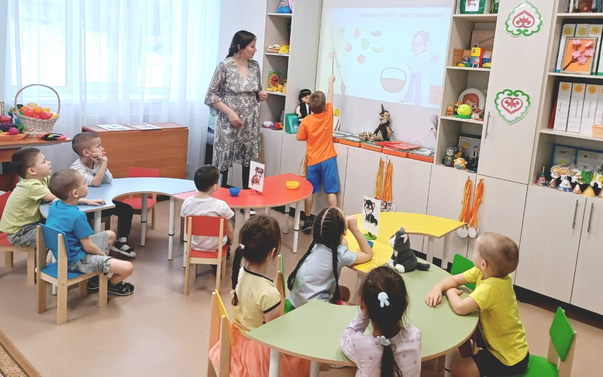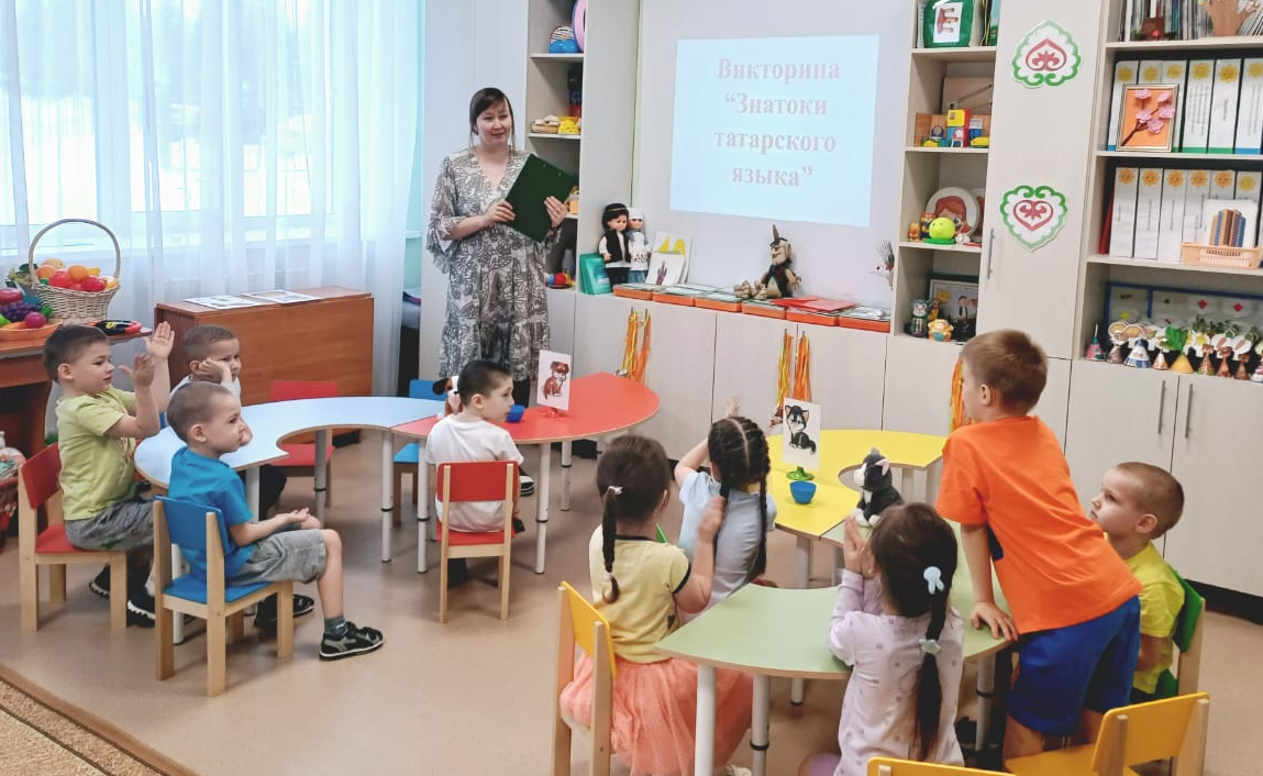 В старшей группе прошла викторина "Знатоки татарского языка". В ней принимали участие две команды: "Акбай" и "Мияу". Обе команды показали хорошие знания по УМК "Говорим по-татарски". И конечно же, игра не обошлась без музыкальных пауз, во время которых дети читали стихи и танцевали.