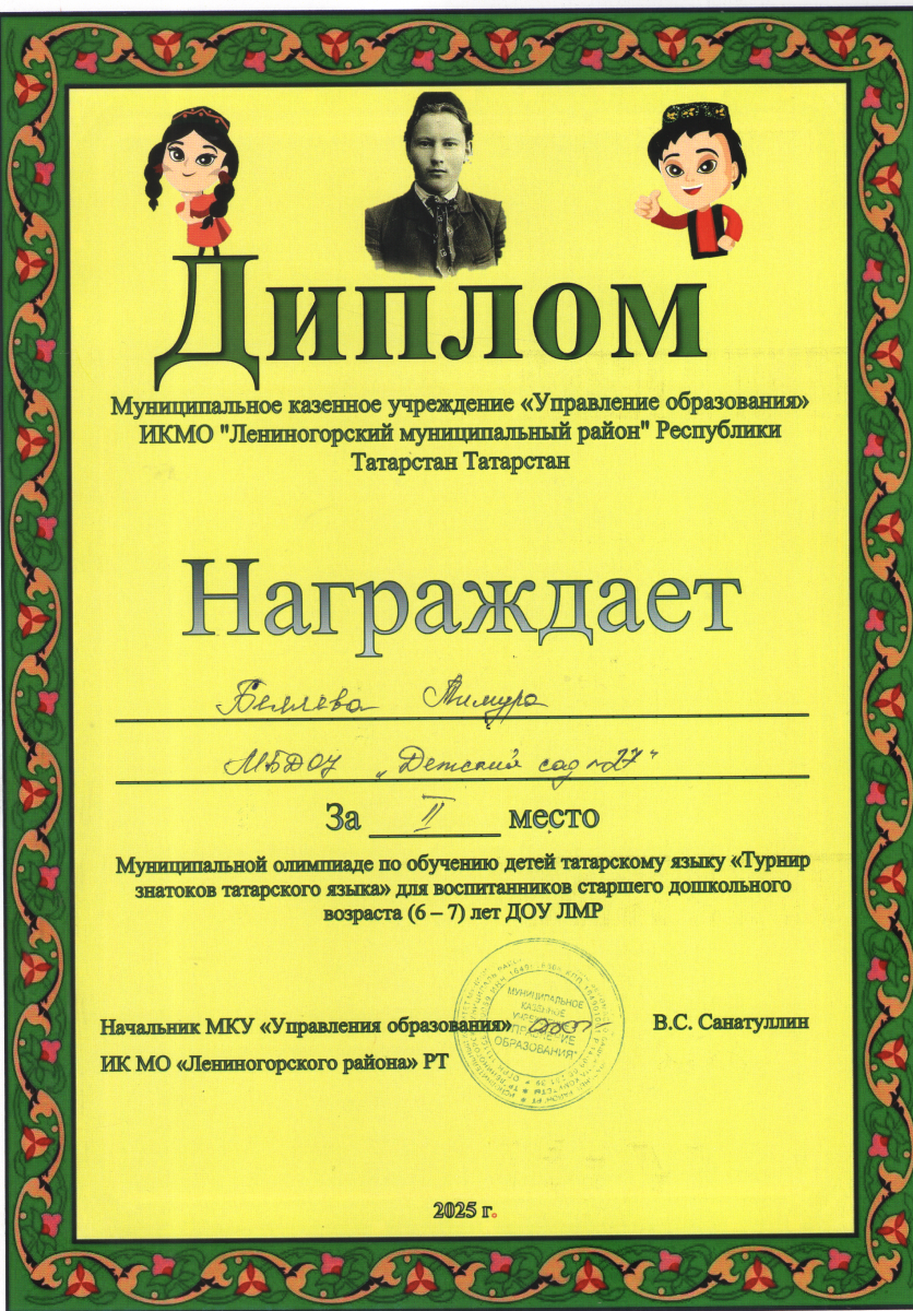 9 нчы балалар бакчасы базасында Лениногорск муниципаль районы мәктәпкәчә яшьтәге (6-7 яшь) балалар өчен балаларга татар телен өйрәтү буенча "Татар телен белүчеләр турниры" муниципаль олимпиадасы узды. Безнең балалар бакчасын мәктәпкә әзерлек төркеме тәрбияләнүчесе Беляев Тимур тәкъдим итте.
