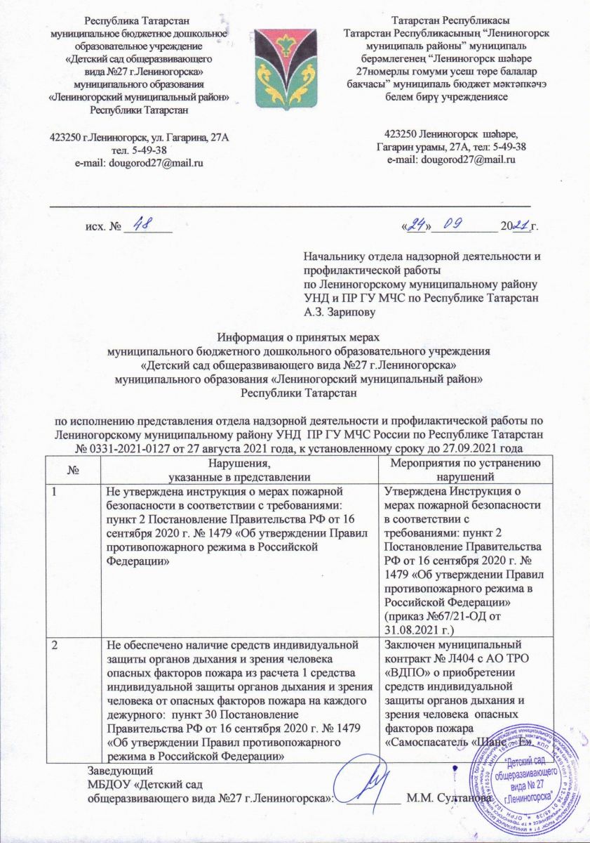 Отчет по исполнению Представления № 0331-2021-0127 от 27.08.2021 года