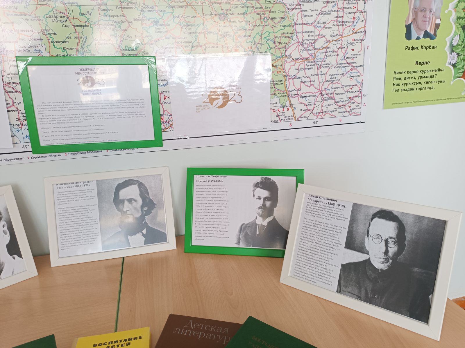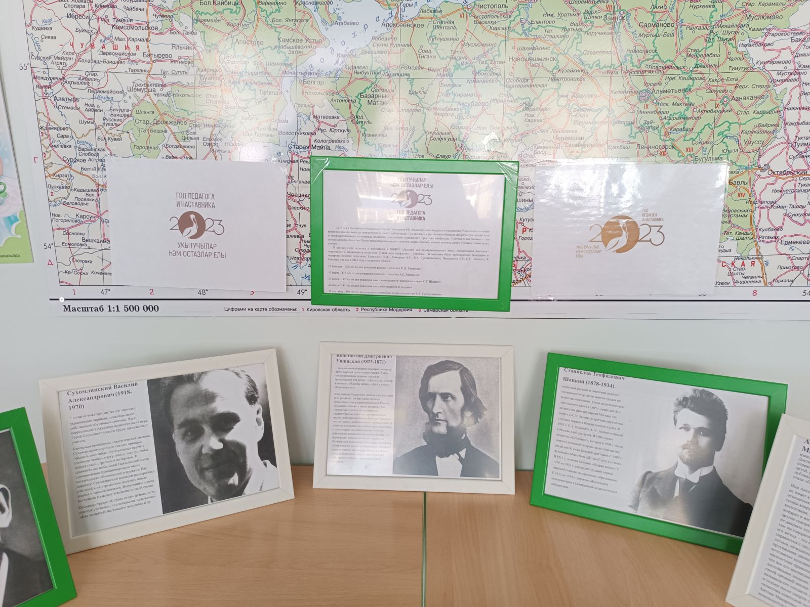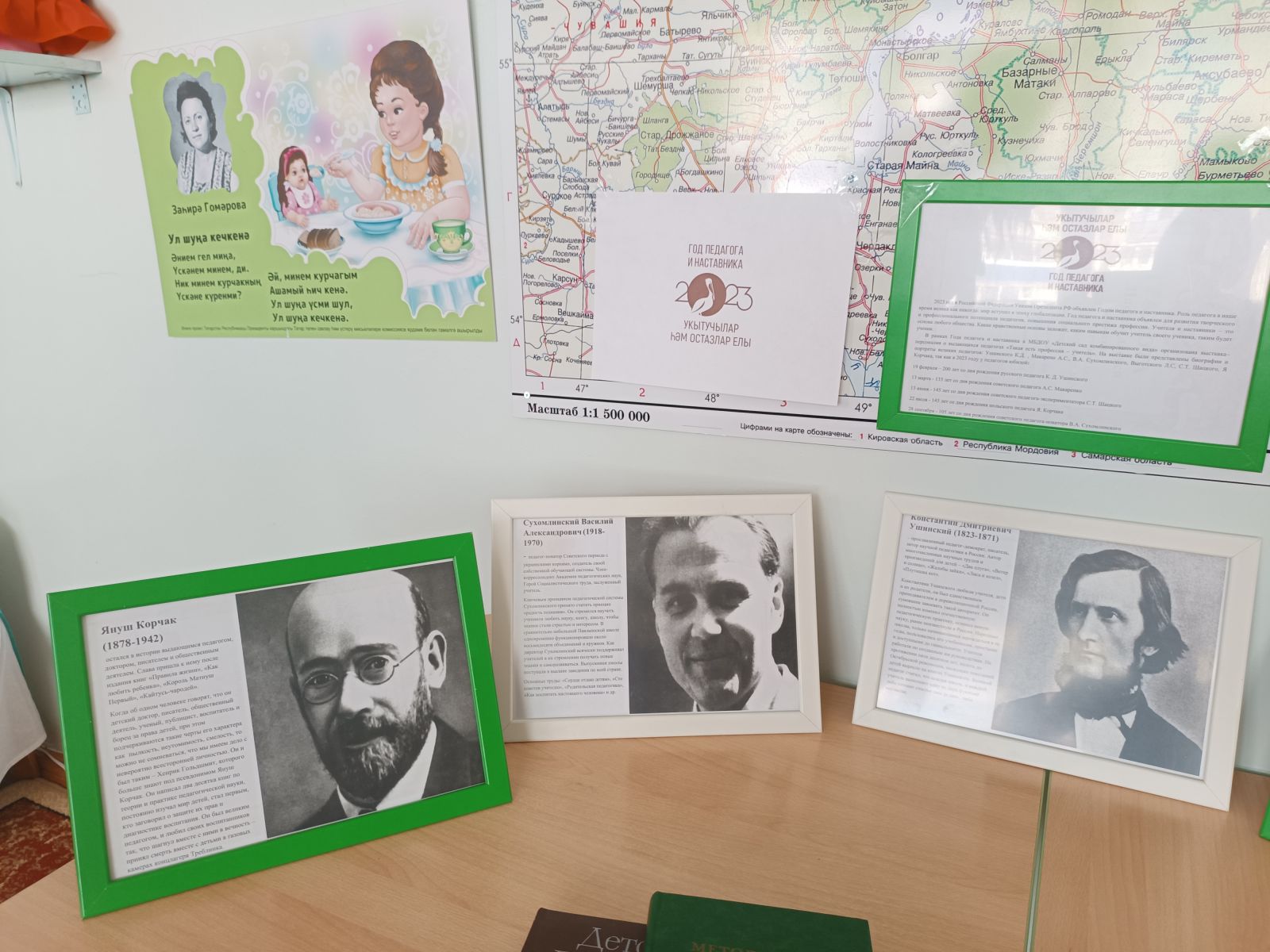 В рамках Года педагога и наставника в МБДОУ «Детский сад комбинированного вида» организована выставка–персоналия о выдающихся педагогах «Такая есть профессия – учитель». На выставке были представлены биографии и портреты великих педагогов: Ушинского К.Д. , Макарено А.С., В.А. Сухомлинского, Выготского Л.С, С.Т. Шацкого, Я Корчака, так как в 2023 году у педагогов юбилей: