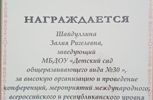 Поздравляем нашу заведующую Шайдуллину Залию Ригелевну с заслуженной Грамотой от начальника МКУ "Управления образования" ИК МО "Лениногорский муниципальный район" РТ В.С. Санатуллина