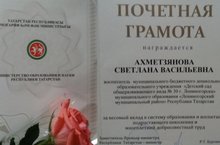 Поздравляем старшего воспитателя Ахметзянову С.В. с Почетной Грамотой Министерства образования и науки РТ.